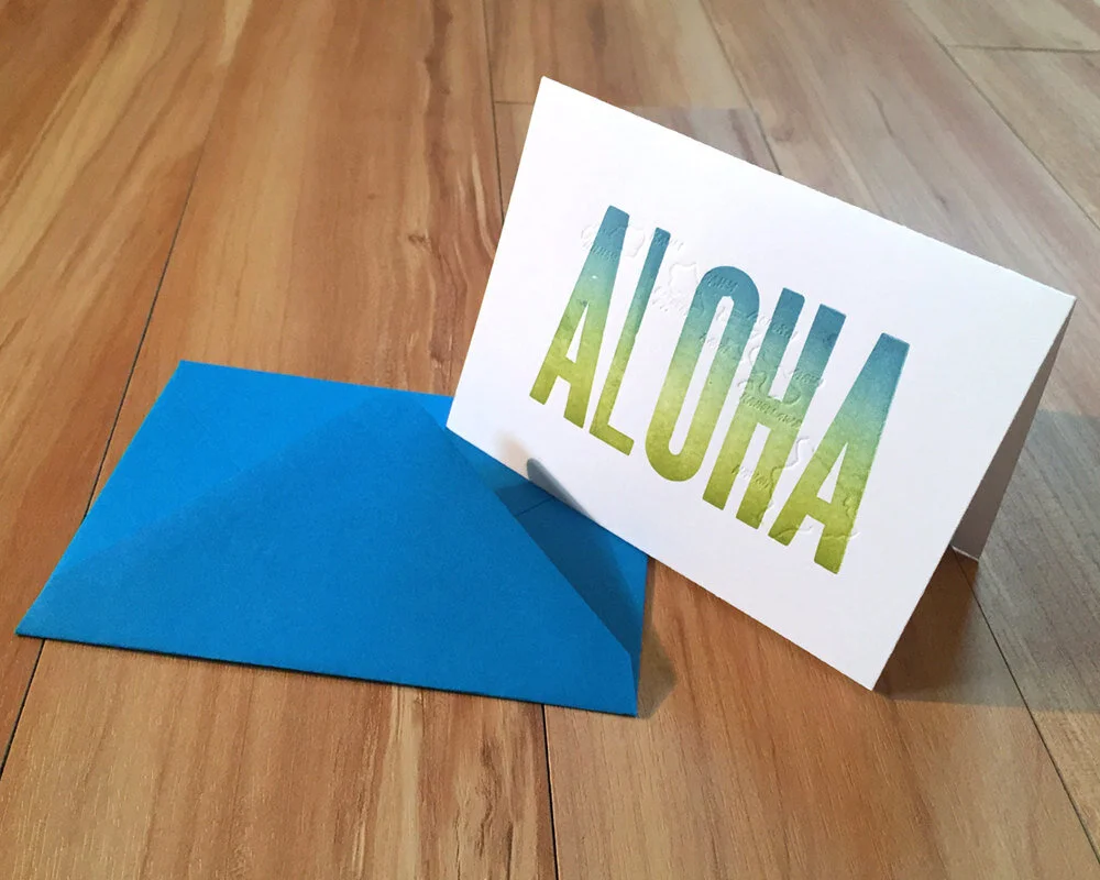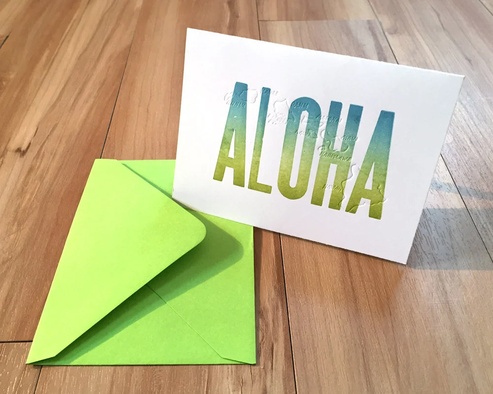 After I let the split fountain layer dry, I blind de bossed the state of Hawaii into the text. To create that, I didn't add ink the image plate. I simply created a deeper imprint on top of the word Aloha. The details of how the blind impression looks is lovely.