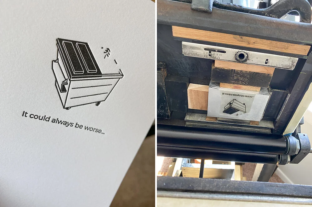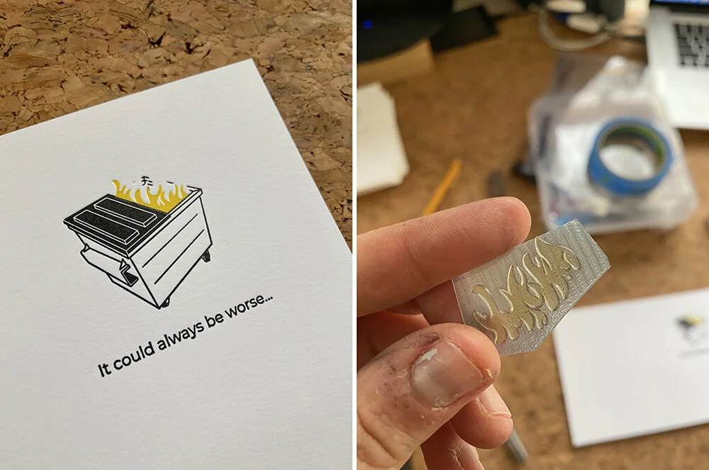 Printing these was a bit of a dumpster fire in itself! The registration (where one color lines up to another) was incredibly tight. I didn’t get as many perfect ones as I would have like through the first run at all. I think the next time, I’d trim off the far side of the dumpster so I don’t have to worry about adjusting for all the little lines in the back.