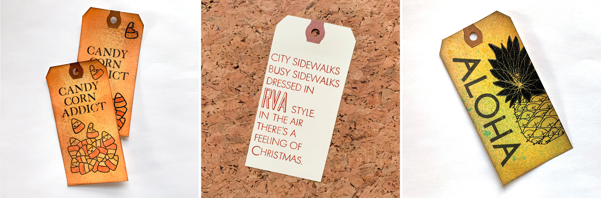 One of my students printed mostly on tags. Each week she came in with a stack of blank tags she ordered online and printed them with simple text. At the end of the class she would take them home and decorate them using stamps and inks. For halloween, she brought me a bag of candy corn with her tag on it! How adorable is this‽