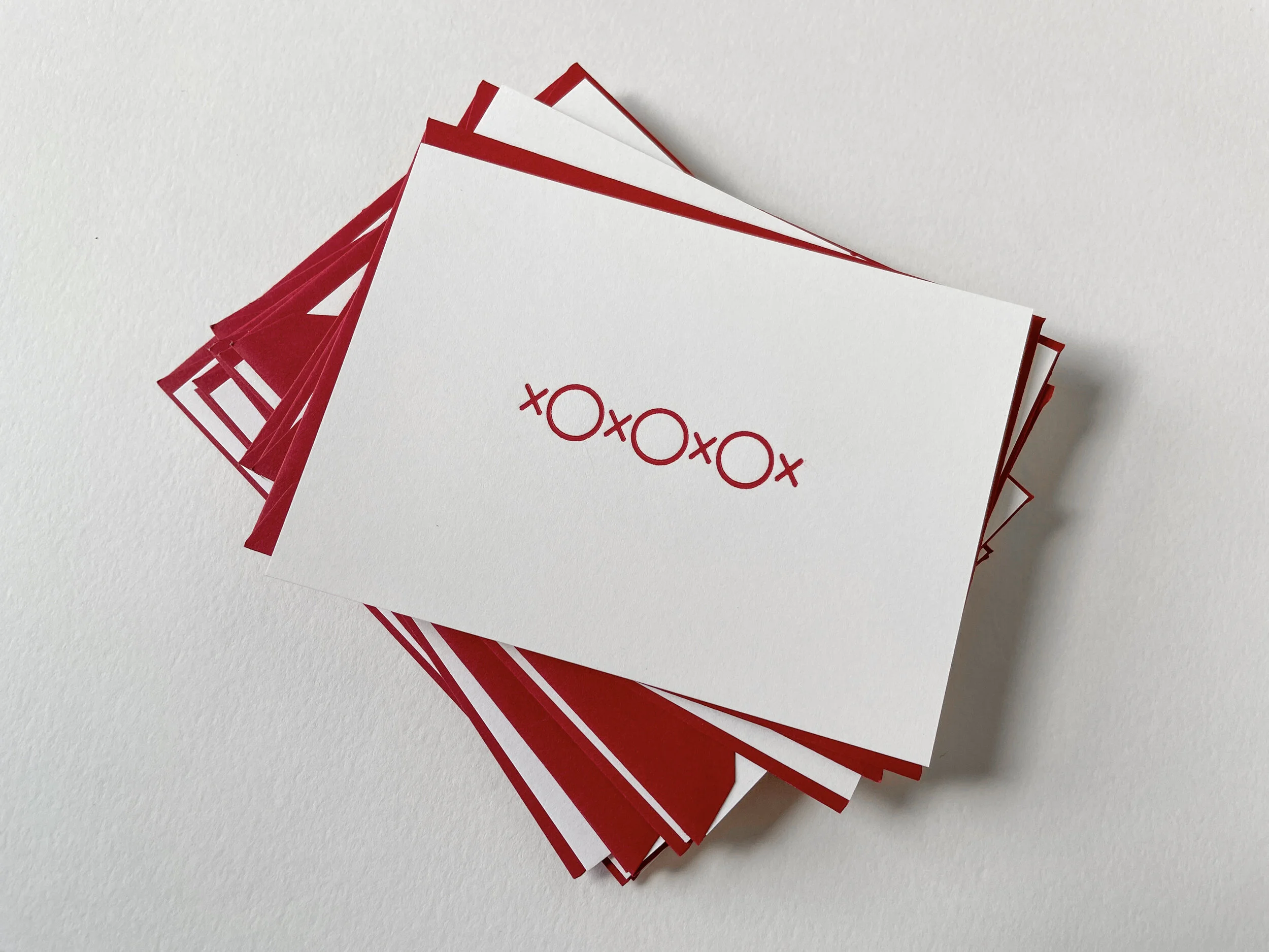 Here are some pictures of the lock up and the printing that went on that evening so many years ago. I tried a few variations of the X’s and O’s before settling in on the final design. The final cards are 4Bar Notecards on 110lb White Cardstock.