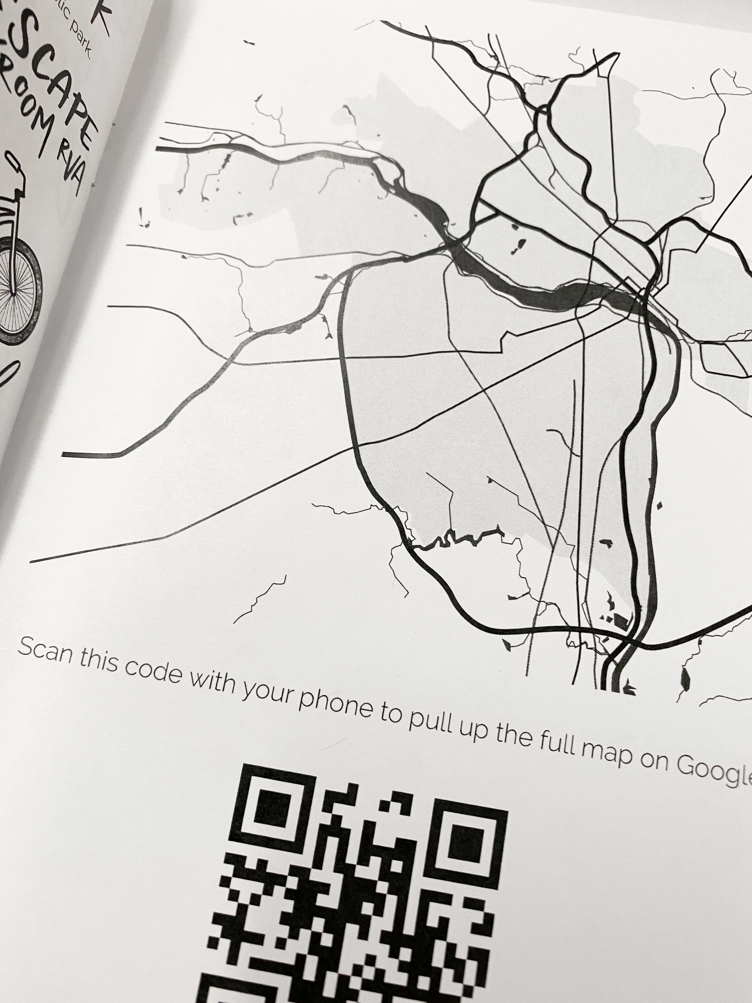 The last page of each book has a minimal map (recycled from Richmond Maps I already sell) with a QR code to link to a full Google Map with all 73 locations.