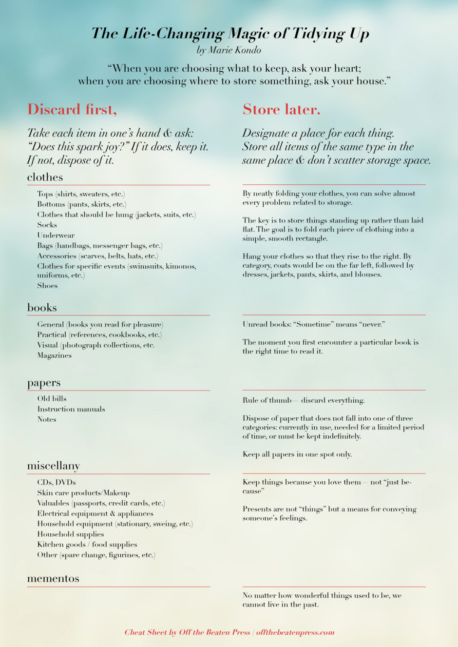 Her new book is called, Spark Joy: An Illustrated Master Class on the Art of Organizing and Tidying Up. To help myself remember what was in the first book, I went back through my copy and pulled out the highlights. Hope you enjoy this little cheat sheet as you are going though all your New Year's tidying! Thanks for stopping by.