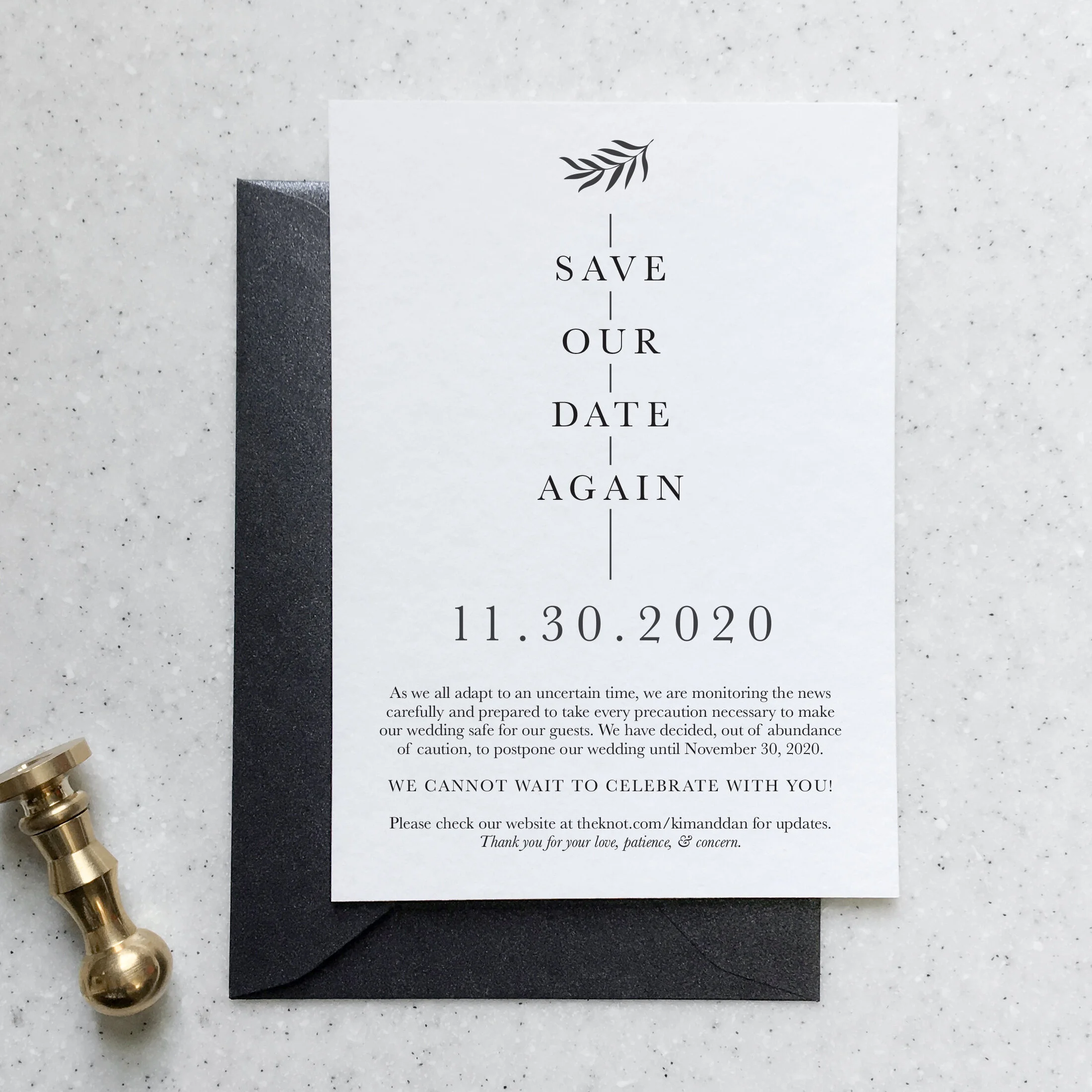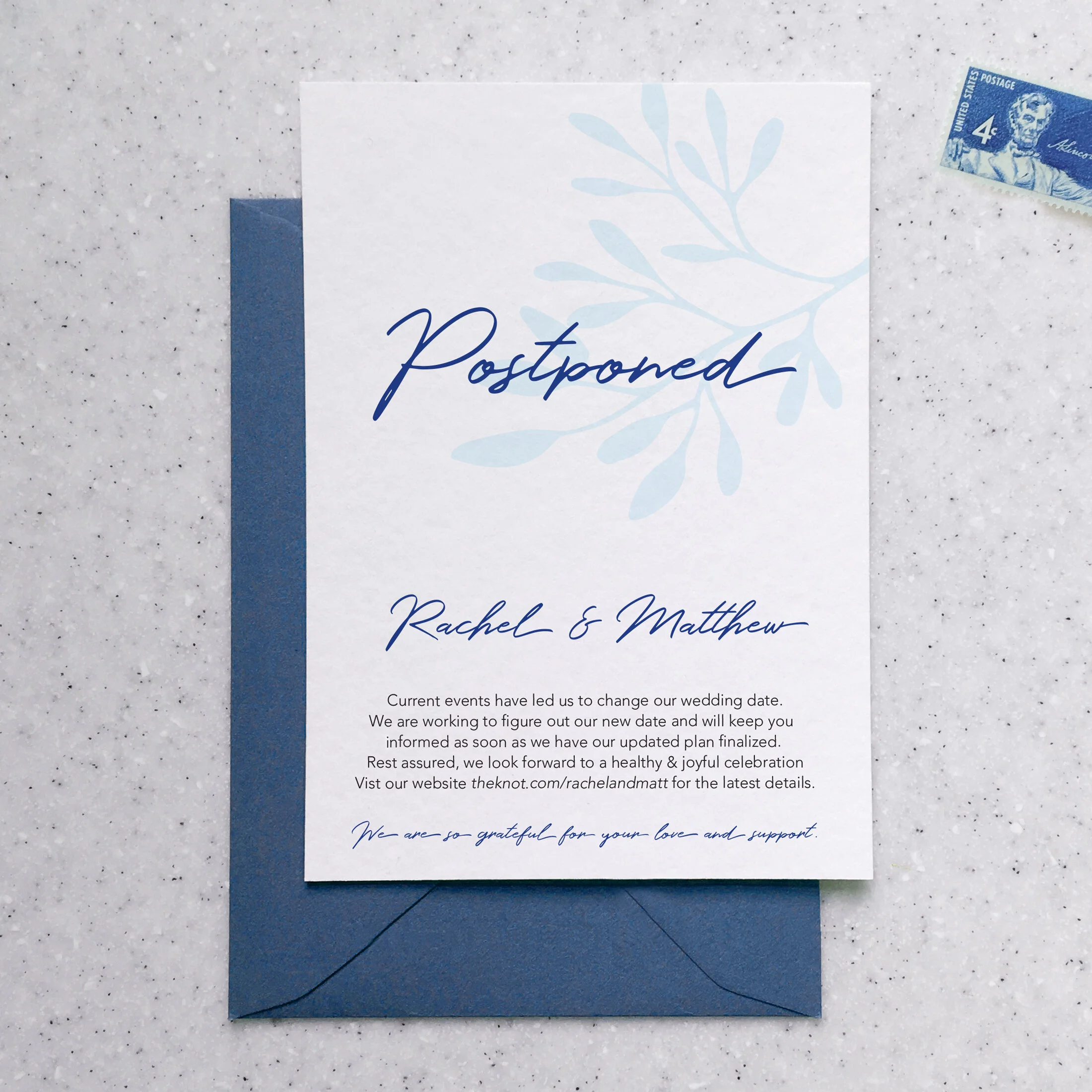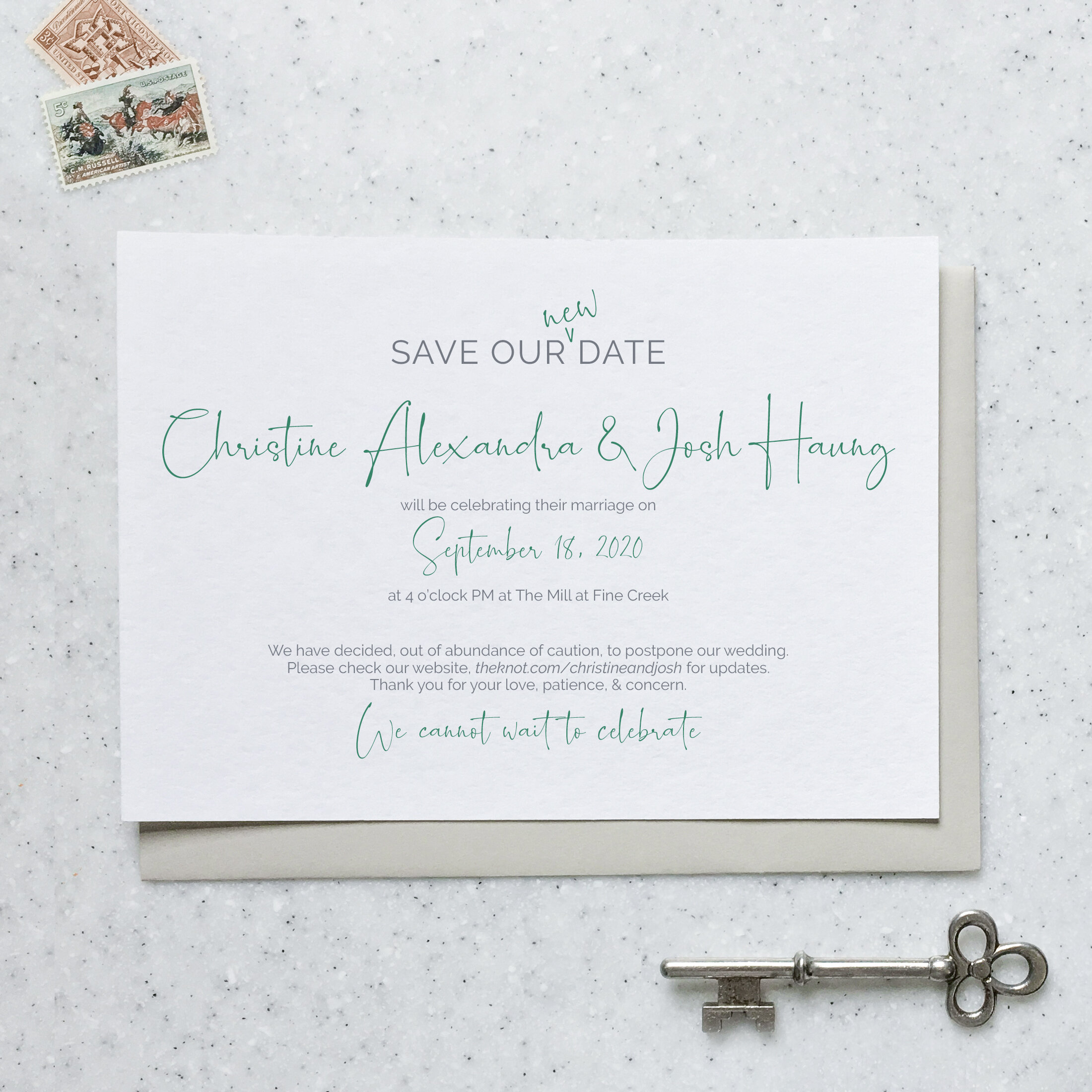 Using the form at the bottom of this page, fill out your details & select one of the three styles shown here. Two are ready to go if you already have a new date, and one is just a simple postponement message. Slight color tweaks are allowed, but no modifications to typographic style. See below for customized options.